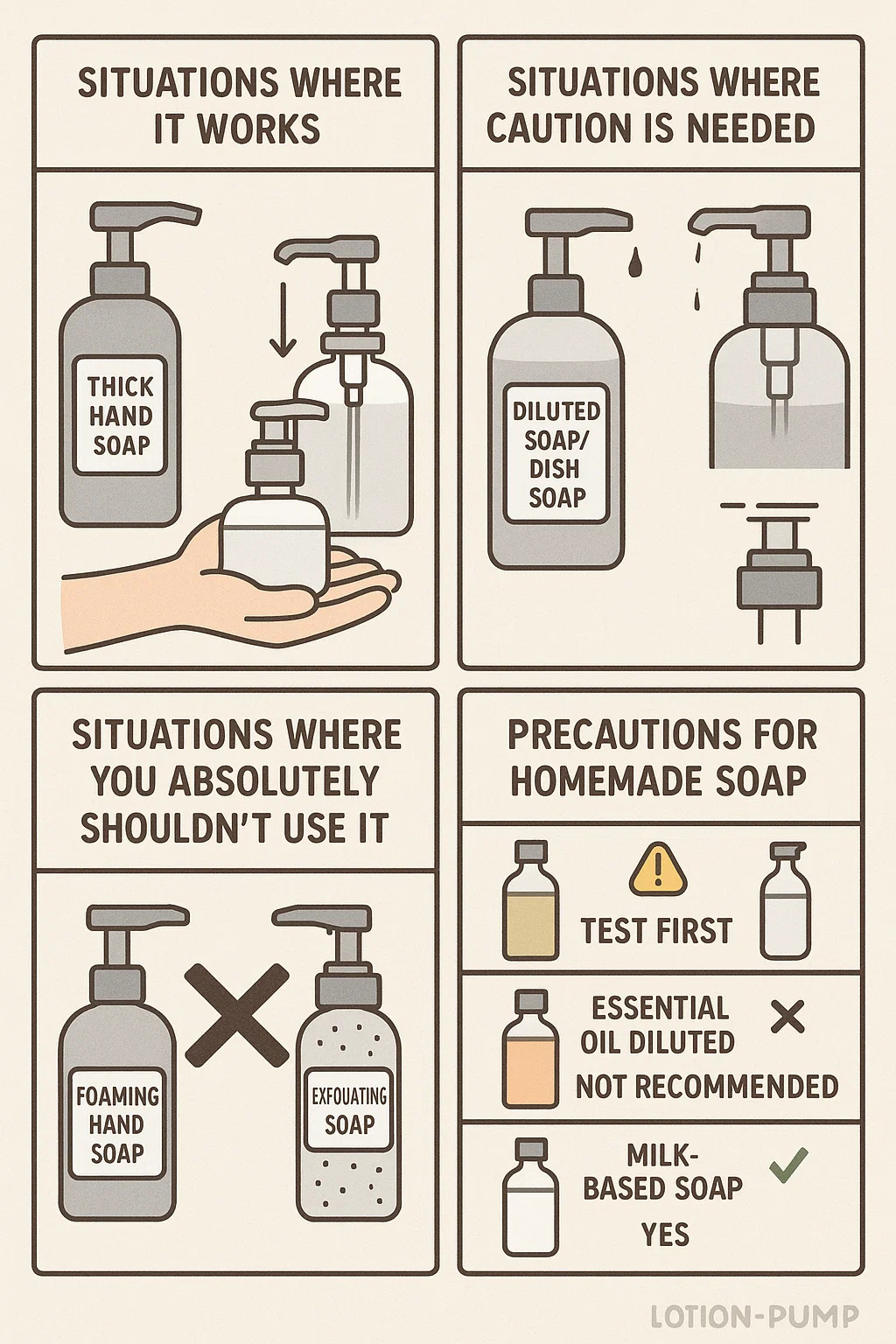 | Jenis sabun | Berfungsi dalam pam losyen? | Langkah utama |