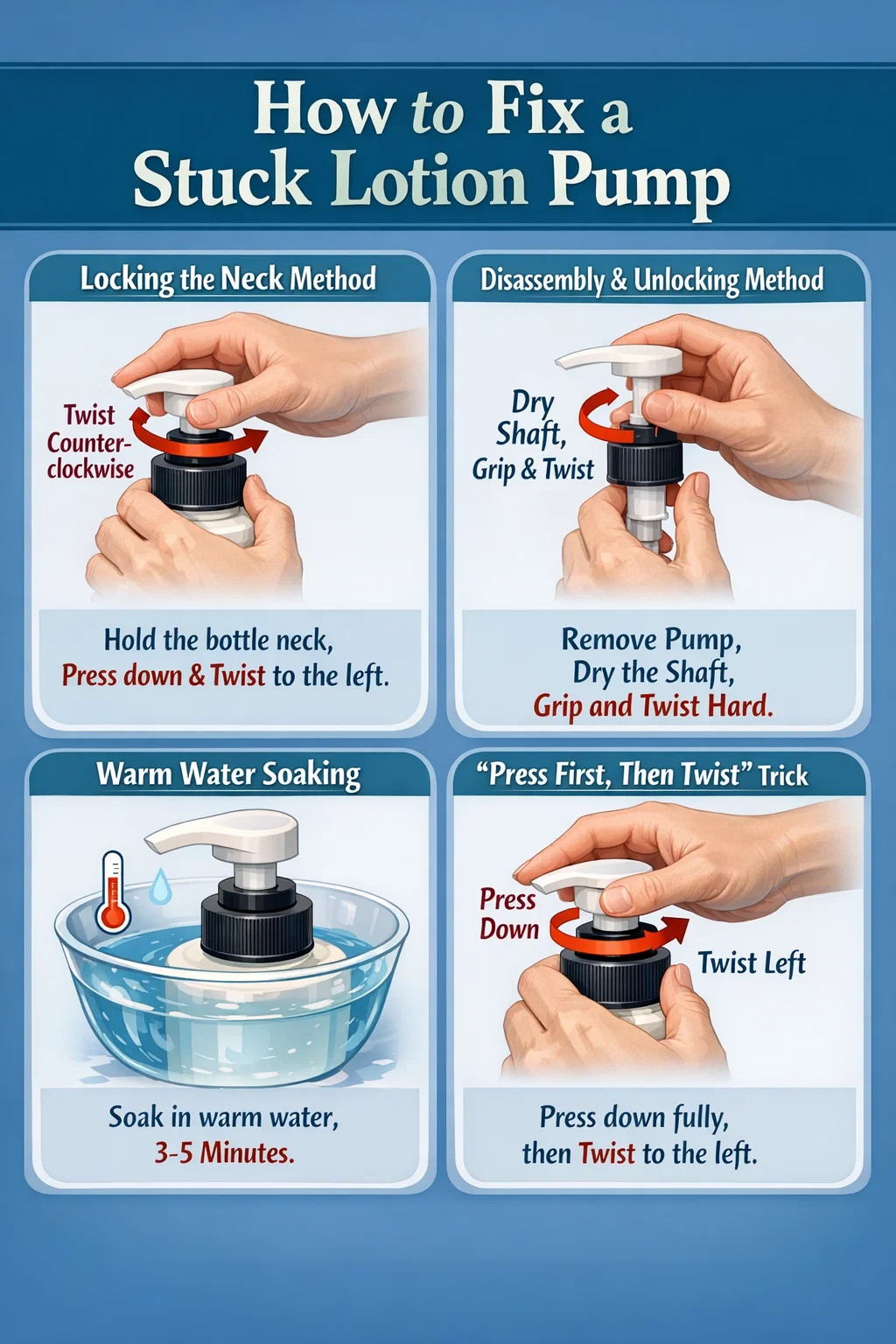 Ia agak mengecewakan apabila anda baru dibeli pam losyen tidak akan muncul tidak kira betapa anda memutarnya. Ini biasanya kerana mekanisme penguncian dalaman terlalu ketat, atau anda tidak memutarkannya dengan cara yang betul.