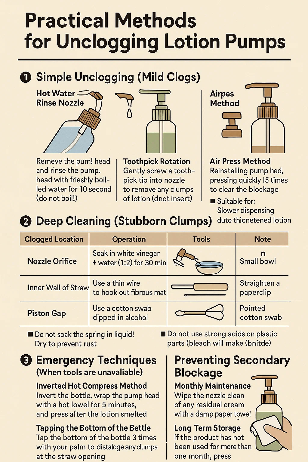 Nozzle Bilas Air Hot: Keluarkan kepala pam dan bilas muncung dengan air yang baru direbus selama 10 saat (jangan mendidih!) Untuk membubarkan losyen kering.
