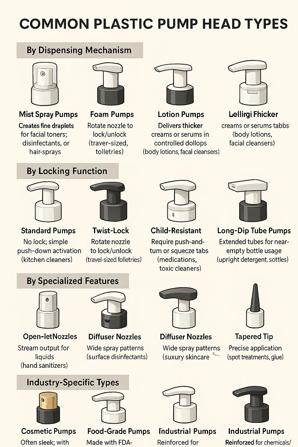 Inilah pecahan biasa kepala pam plastik Jenis berdasarkan reka bentuk dan aplikasi fungsional mereka: