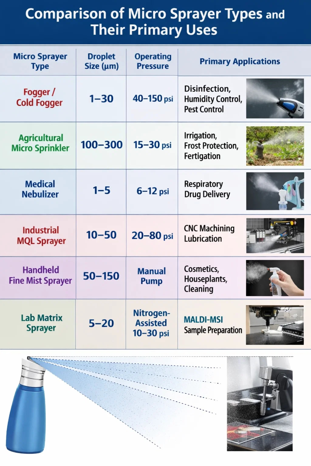 | Jenis Penyembur Mikro | Saiz Titisan (µm) | Tekanan Operasi | Aplikasi Utama |