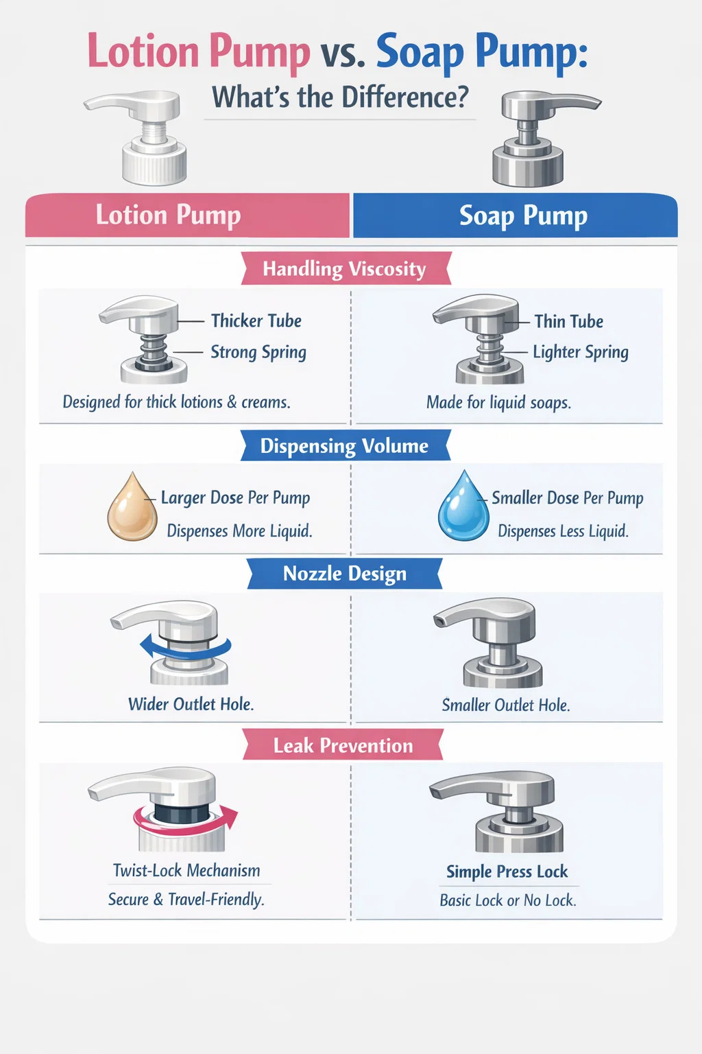 Walaupun pam losyen dan pam sabun kelihatan sangat serupa dan sering digunakan secara bergantian, ia mempunyai perbezaan yang ketara dalam reka bentuk dan fungsi dalaman mereka.